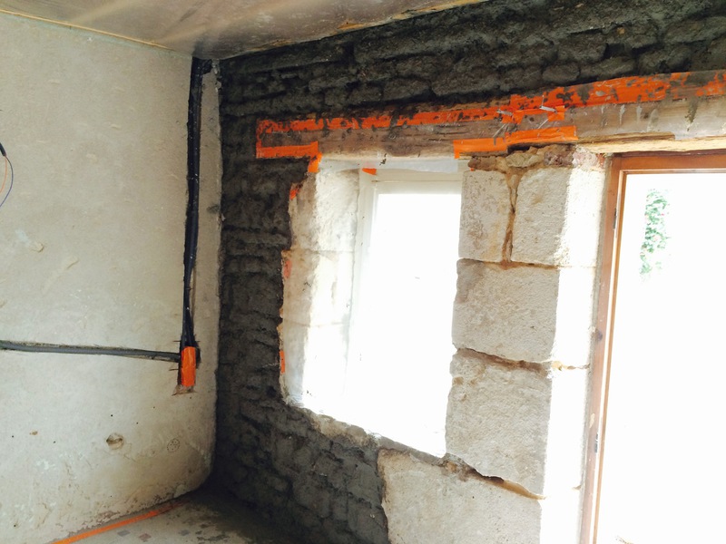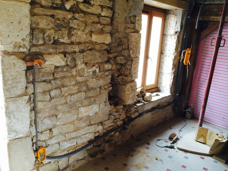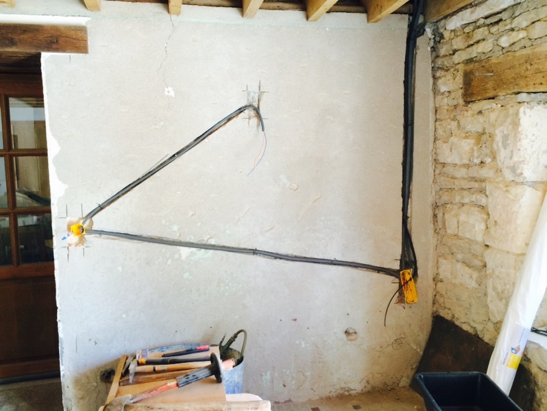 après avoir passé de laborieuses heures à manier le marteau-piqueur pour ramener les murs à leur état initial (pierres et terre d'arène), à manier la scie circulaire pour creuser les tranchées destinées à recevoir la nouvelle installation électrique, nous avons pu procéder à la restauration des murs.