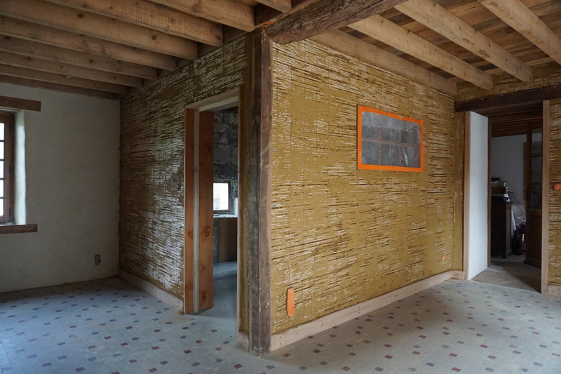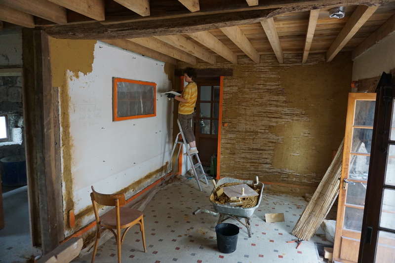 En chaux-chanvre pour les murs extérieurs afin d'assurer une régulation de la température, en terre et paille pour les murs intérieurs.